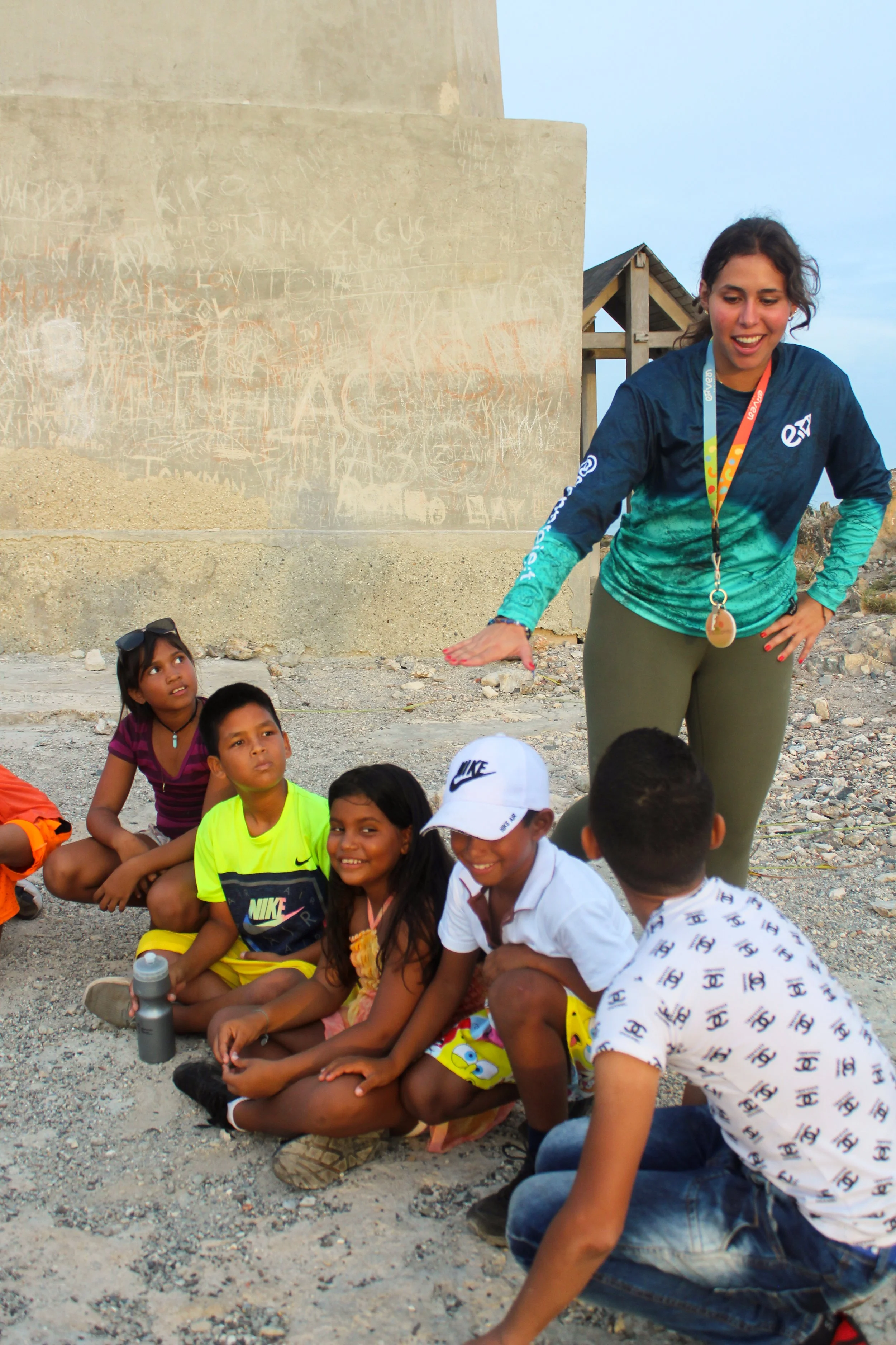 Teacher Fabiana compartiendo con alumnos en el faro de Los Roques.